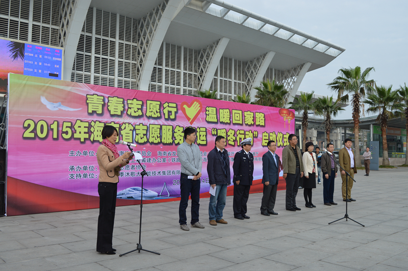 2015年春運(yùn)自2月4日開始至3月15日結(jié)束,為期40天。2月4日上午,以“青春志愿行,溫暖回家路”為主題的“2015年海南省志愿服務(wù)春運(yùn)暖冬行動(dòng)”在海口動(dòng)車東站站前廣場(chǎng)正式啟動(dòng),F(xiàn)場(chǎng)來自團(tuán)省委,海南省青聯(lián)經(jīng)濟(jì)界別、北京工商大學(xué)海南校友會(huì)志愿服務(wù)隊(duì)、粵海鐵、民航等志愿服務(wù)隊(duì)參加了啟動(dòng)儀式。
